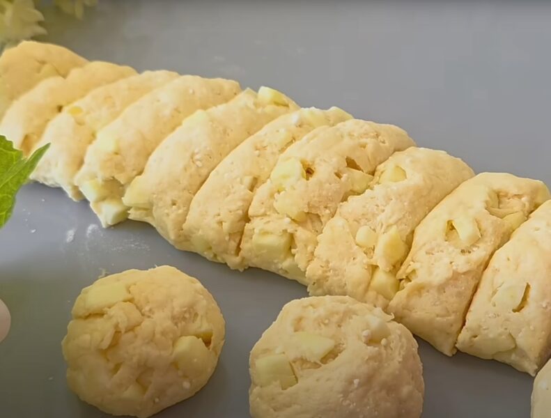 No mīklas izveido nelielu “desiņu” un sadali 10–12 daļās.