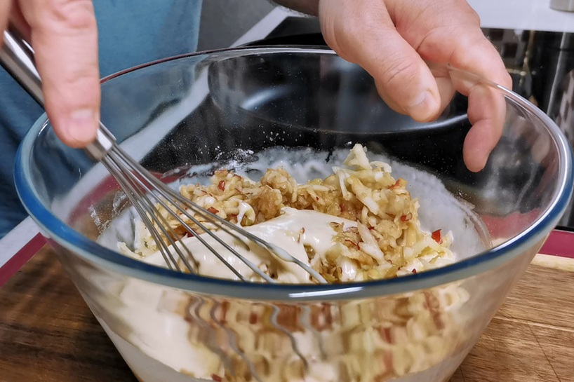 Rīvētie āboli jāliek mīklā uzreiz, citādi tie sāks brūnēt. Ja āboli ir ļoti sulīgi, var nedaudz nospiest lieko sulu, bet ne pārāk – tieši tā sula piešķir plācenīšiem to īpašo sulīgumu. Labi samaisi mīklu – tā būs nedaudz bieza, bet viegli krēmīga.