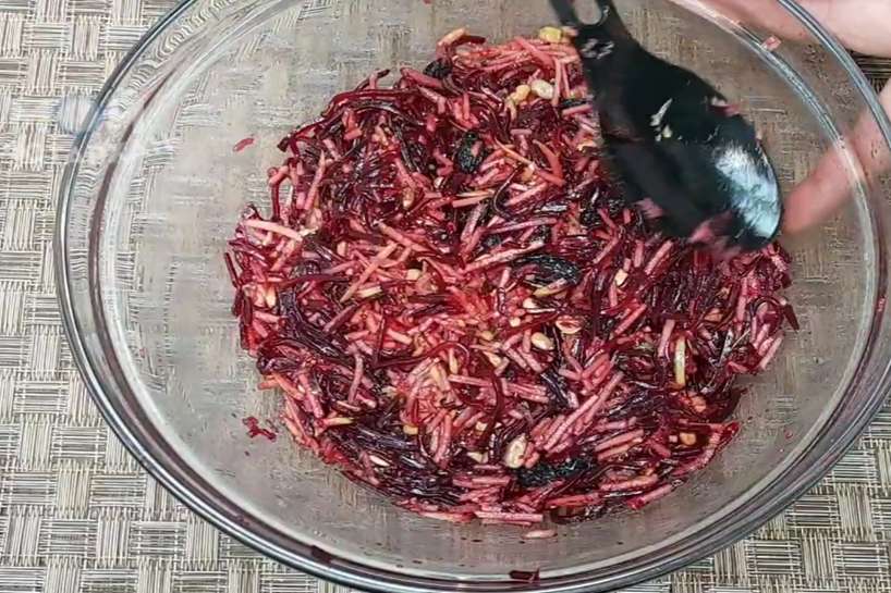 Lielā bļodā liec sarīvētas bietes, ābolus, rozīnes un sēklas. Pievieno sāli, franču garšaugus un eļļu. Maigi samaisi ar karoti.