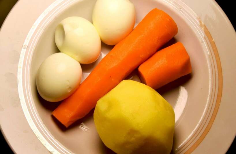 Vispirms izvāri dārzeņus – bietes, burkānus, kartupeļus un olas. Svarīgi tos nepārvārīt, lai saglabātu stingru struktūru. Pēc tam atdzesē un nomizo. Siļķi notīri no asakām un ādas, sagriez nelielos kubiņos. Izvēlies mazsālītu siļķi, jo pārāk sāļa var sabojāt līdzsvaru ar ābolu un majonēzi.