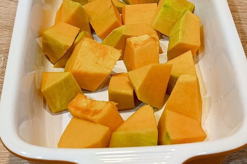 Nomizo ķirbi, izņem sēklas un sagriez nelielos gabaliņos. Lieci uz cepamās plāts, pārklātas ar cepamo papīru, un cep 180°C temperatūrā 20–30 minūtes, līdz tas kļūst mīksts. Karstu ķirbi sablendē līdz vienmērīgam biezenim un atstāj atdzist. 👉 Padoms: ķirbja biezeni vari sagatavot iepriekš — tas ledusskapī labi glabājas 2–3 dienas.