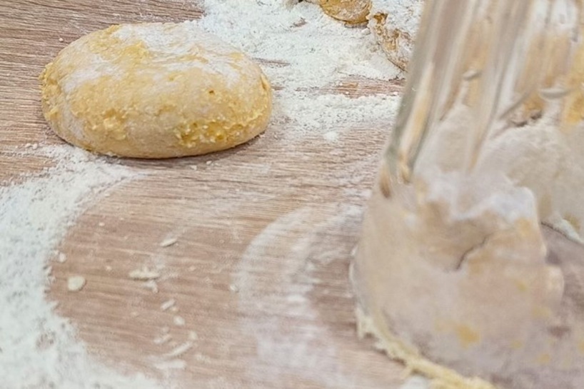 Ar mitrām rokām veido nelielas bumbiņas, tad tās viegli saplacini. Apviļā katru plācenīti miltos. 👉 Lai tie būtu vienādi un glīti, vari izmantot glāzi — liec ap to un nedaudz pagrozot, iegūsi perfektu apli.
