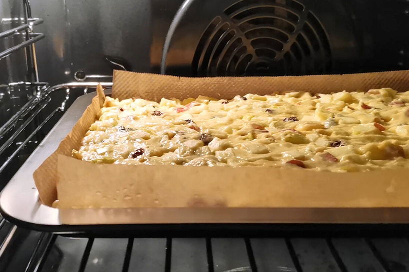 Kad viss sajaukts, atliek tikai pārliet mīklu uz plāts, kas izklāta ar cepamo papīru. Izlīdzina ar karoti vai lāpstiņu.