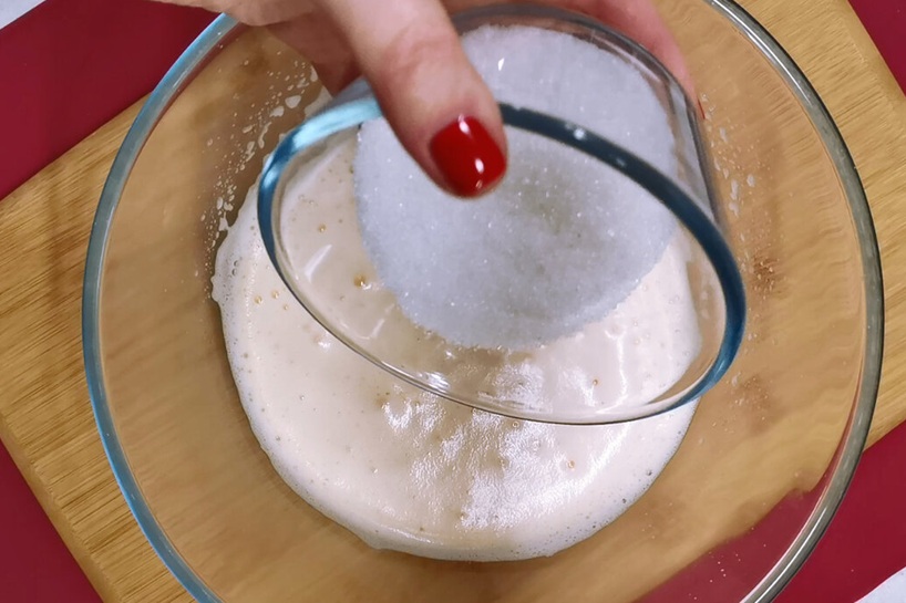 Pievieno cukuru un vaniļas cukuru, turpina maisīt, līdz graudiņi izšķīst. Ielej izkausētu un atdzesētu sviestu, visu vienmērīgi samaisa.