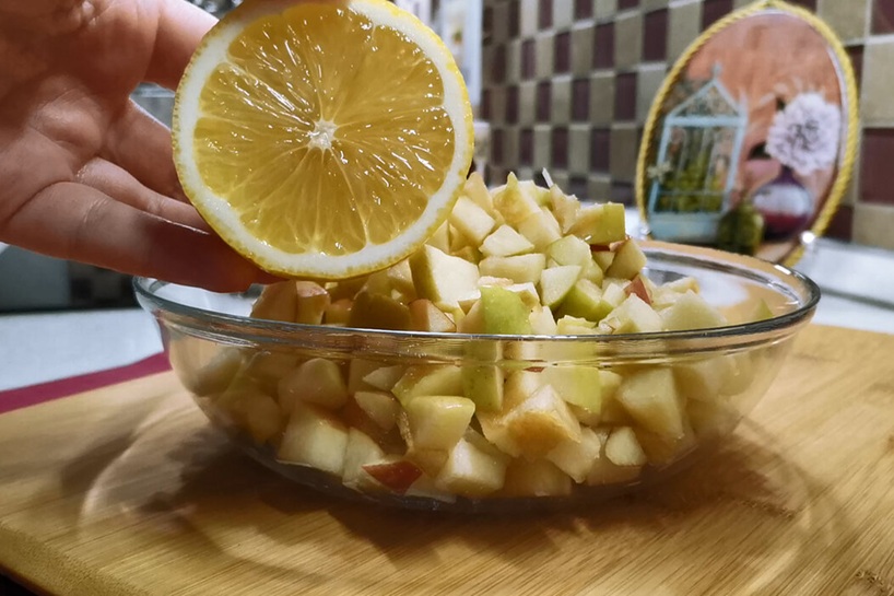 Ābolus nomazgā, izņem serdes un sagriež nelielos kubiciņos. Ja āboli ir maigi, mizu var atstāt — pīrāgs būs vēl sulīgāks. Pielej mazliet citrona sulas, lai āboli nenobrūnētu, un pievieno mīklai.