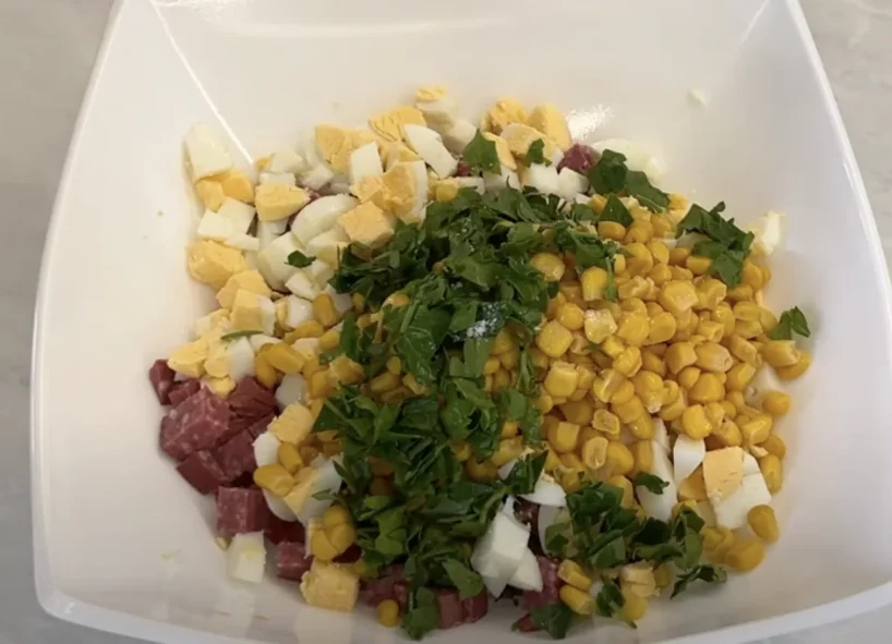 Lielā bļodā liec visas sastāvdaļas: desu, olas, papriku, kukurūzu un smalki sakapātus pētersīļus. -