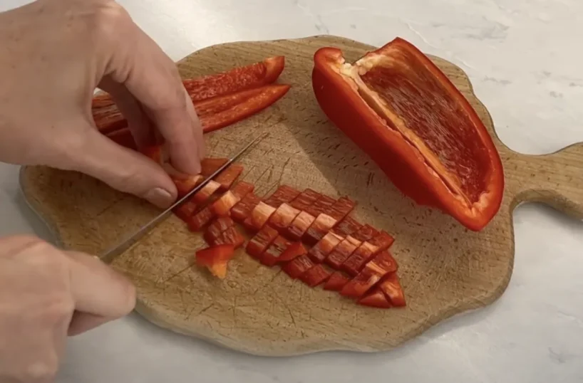 Papriku un desu sagriez mazos kubiņos vai salmiņos — kā ērtāk. Olas novāri, atdzesē, nomizo un arī sagriez kubiņos.