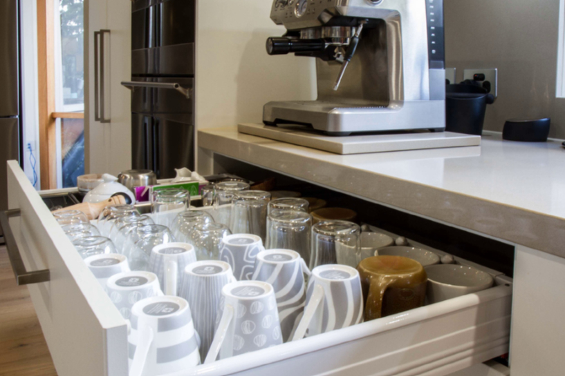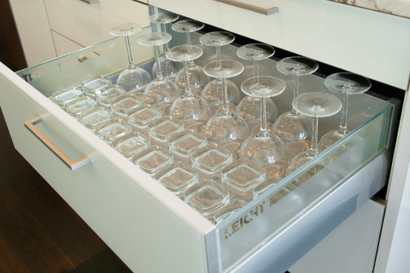 Glāžu un krūžu glabāšana apgrieztā veidā var būt arī ērtāka telpas organizācijas ziņā. Tās var sakārtot vienu otrā, tādējādi ietaupot vietu. Apgāzts novietojums ļauj traukus glabāt kompaktāk un drošāk.