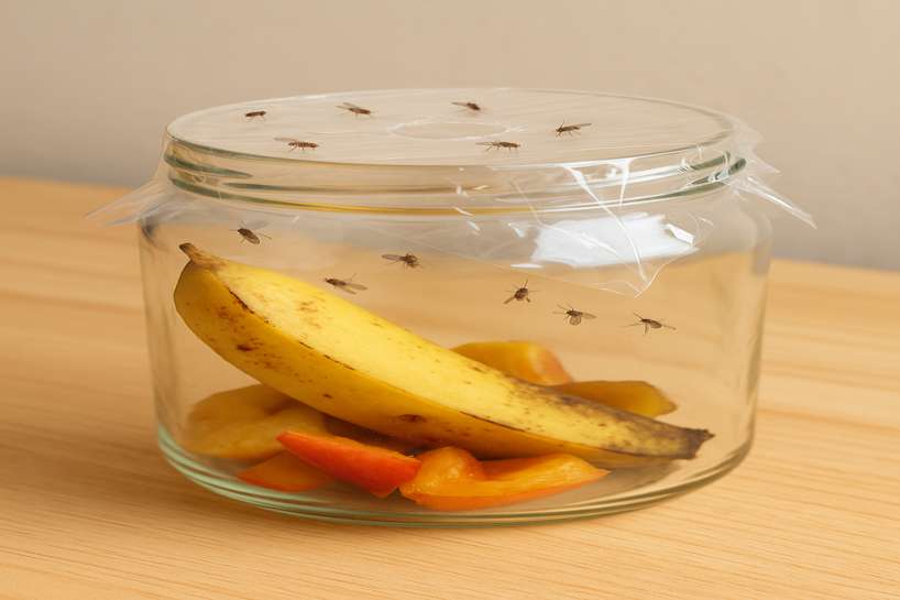 Paņemiet nelielu burciņu vai trauku un ievietojiet tajā pāris gabaliņus nogatavojušos banānu vai ābolu mizas – šie aromāti ir īsts kārums augļu mušiņām. Pārsedziet trauku ar pārtikas plēvi un ar zobu bakstāmo vai dakšiņu izduriet dažus nelielus caurumus.