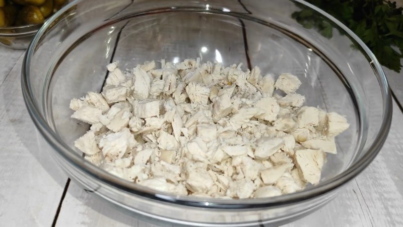 Vistas fileju novāra viegli sālītā ūdenī, līdz tā kļūst mīksta un sulīga. Atdzesē un sagriež nelielos kubiņos — liek lielā bļodā.