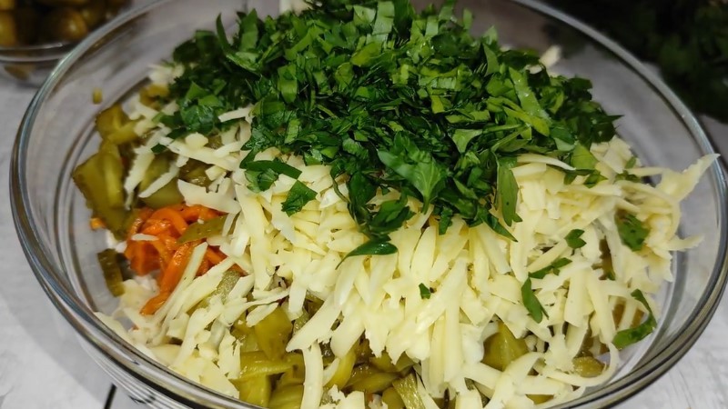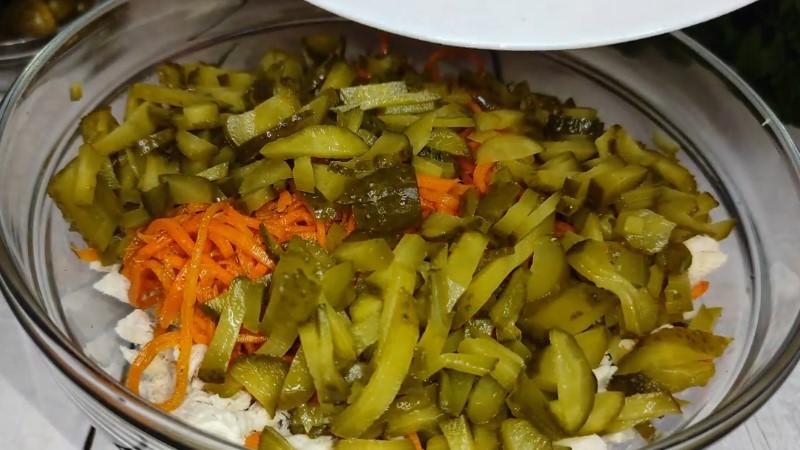 Marinētos gurķus sagriež plānās strēmelēs. Tie piešķir salātiem atspirdzinošu garšu.