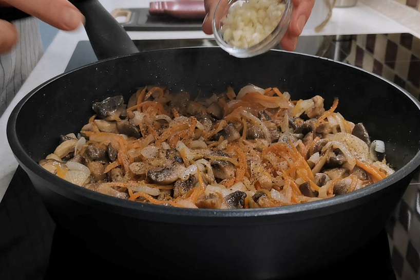 Pannā uzkarsē eļļu, pievieno smalki sagrieztu sīpolu un rīvētus burkānus. Cep uz vidējas liesmas, līdz sīpoli kļūst zeltaini. Tad pievieno sēnes un cep apmēram 10–15 minūtes, līdz tās apbrūnē un izdala aromātu.