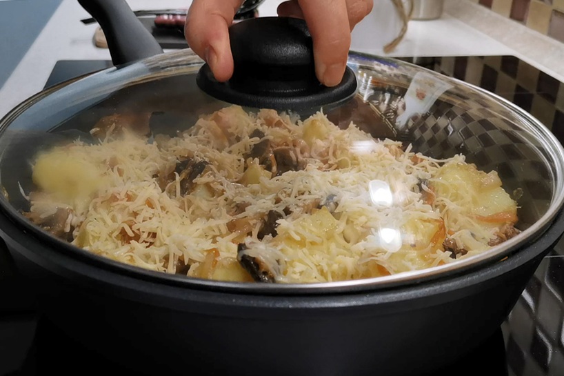 Kad viss gandrīz gatavs, pārkaisa rīvētu sieru. Nevajag maisīt – vienkārši pārklāj pannu ar vāku un ļauj sieram pāris minūtes izkust. Tas apvienos sastāvdaļas un piešķirs maigu, krēmīgu garšu.