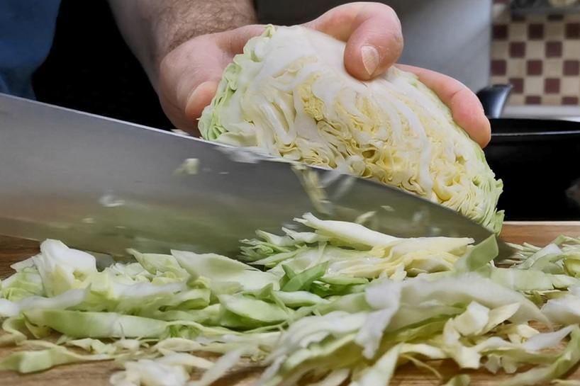 Smalki sagriez jebkuras šķirnes kāpostus (var būt arī ziemas kāposti). Mazliet pievieno sāli un pamasē ar rokām, lai kāposti kļūst mīkstāki un sulīgāki.