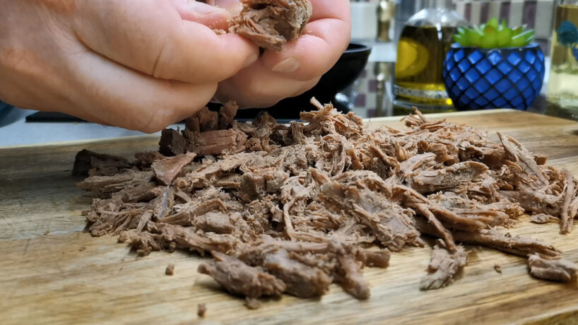 Vāri cūkgaļu, liellopu vai vistas gaļu, tad sadali to šķiedrās. Tā piešķir salātiem labāku tekstūru nekā griezti gabaliņi.