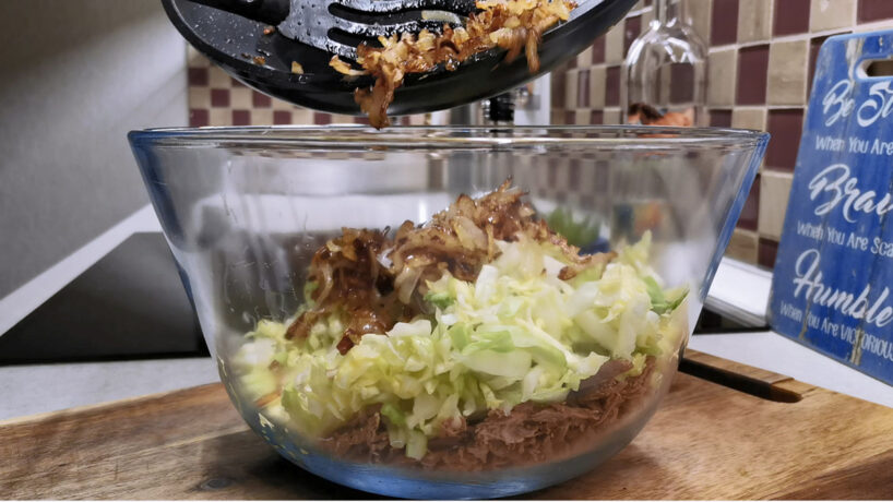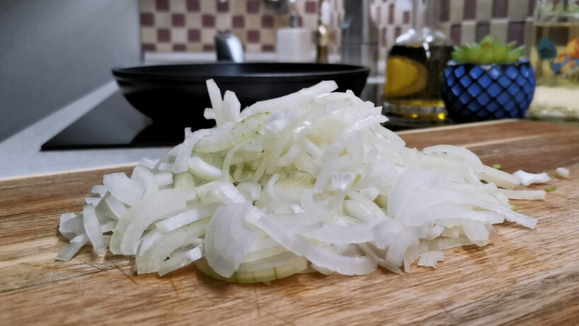 Sagriez sīpolu plānās šķēlēs un apcep līdz zeltainam. Tieši šis solis piešķir “to īsto garšu”.