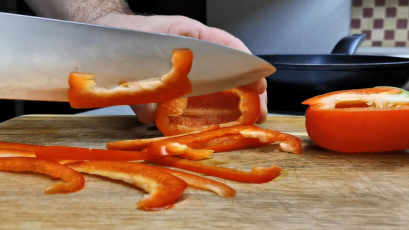 Pievieno strēmelēs sagrieztu sarkano papriku un sagrieztus marinētus gurķīšus. Tas piešķir gan krāsu, gan patīkamu svaigumu un līdzsvaro gaļas sātīgumu.