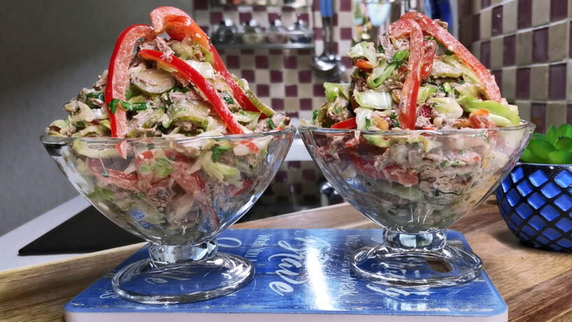 Recepte nāk no Gruzijas virtuves — ne gluži klasika, bet garšas ziņā pilnīgs baudījums: sātīgi, aromātiski, pikanti, ar vieglu riekstu noti. Kāposti te ir tikai pamats — salātos ir arī gaļa un vairākas sastāvdaļas, kas padara tos patiesi bagātīgus un svinīgus.