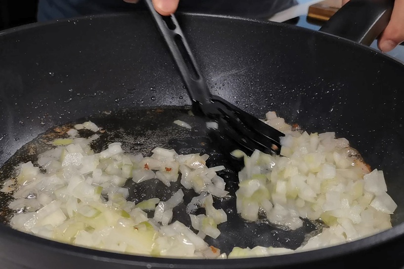 Tajā pašā pannā sacep smalki sagrieztus sīpolus, līdz tie kļūst mīksti un viegli zeltaini. Pievieno mazliet sviesta un vēl nedaudz ķiploka — aromāts kļūst patiesi kārdinošs.