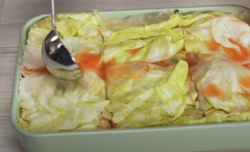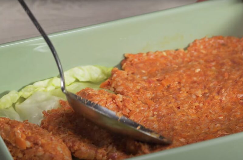 Cepamo formu ieeļļo ar nedaudz eļļas. Izklāj kāpostu lapu kārtu, pa virsu liec pildījuma slāni. Atkārto, līdz beidzas sastāvdaļas. Pēdējam jābūt kāpostu lapu slānim.Šobrīd daudzi lasa