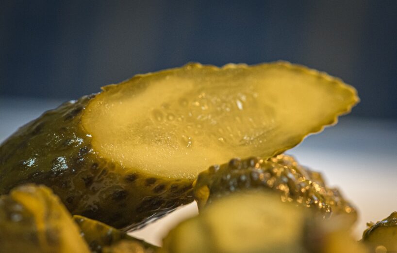 Marinētos gurķus sagriez mazos kubiņos un liec virs zirnīšiem. Tie piešķirs salātiem patīkamu skābenumu un kraukšķīgumu.