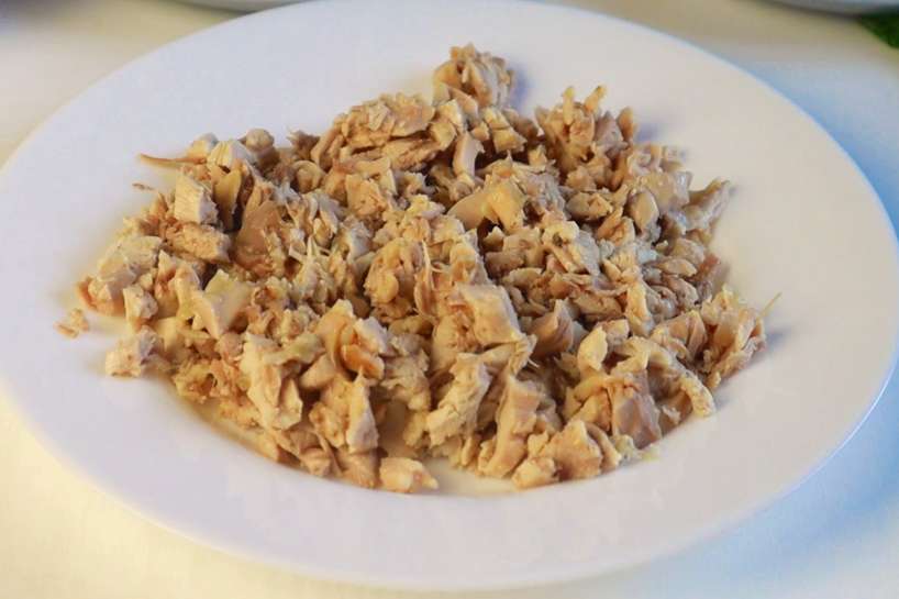 Novāri vistas fileju viegli sālītā ūdenī, ļauj atdzist un sagriez mazos kubiņos.