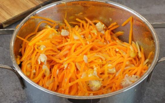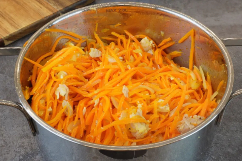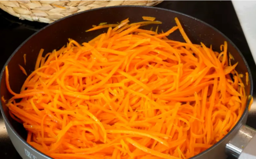 Paņemam dziļu pannu, ielejam eļļu, uzkarsējam, liekam burkānus un apcepam. Līdz gatavībai tos nevajag gatavot – galvenais, lai tie kļūtu mīkstāki un apjoms samazinātos. Noņemam no uguns.