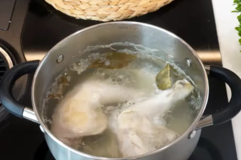 Vispirms liekam vārīties vistas stilbus – ielejam ūdeni, ieliekam stilbus, pievienojam sāli un lauru lapu, un vāram, līdz tie gatavi. Pēc tam izņemam un ļaujam gaļai atdzist.