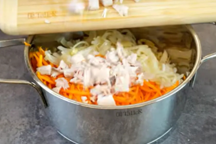 Citā pannā nelielā eļļas daudzumā apcepam sīpolus līdz puscaurspīdīgumam. Atdzisušo gaļu atdalām no kauliem un sagriežam kubiņos.