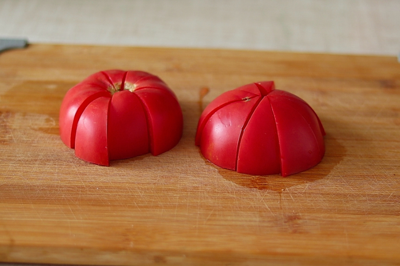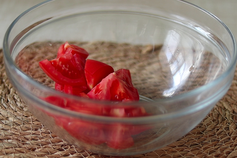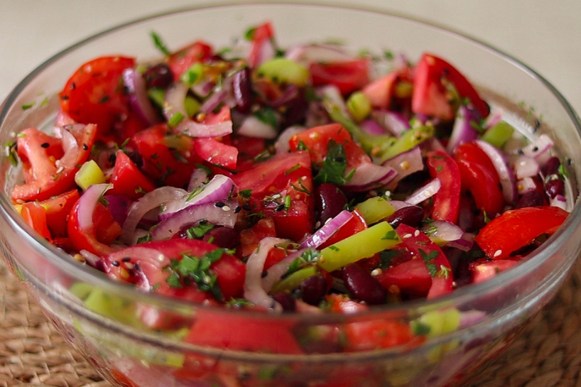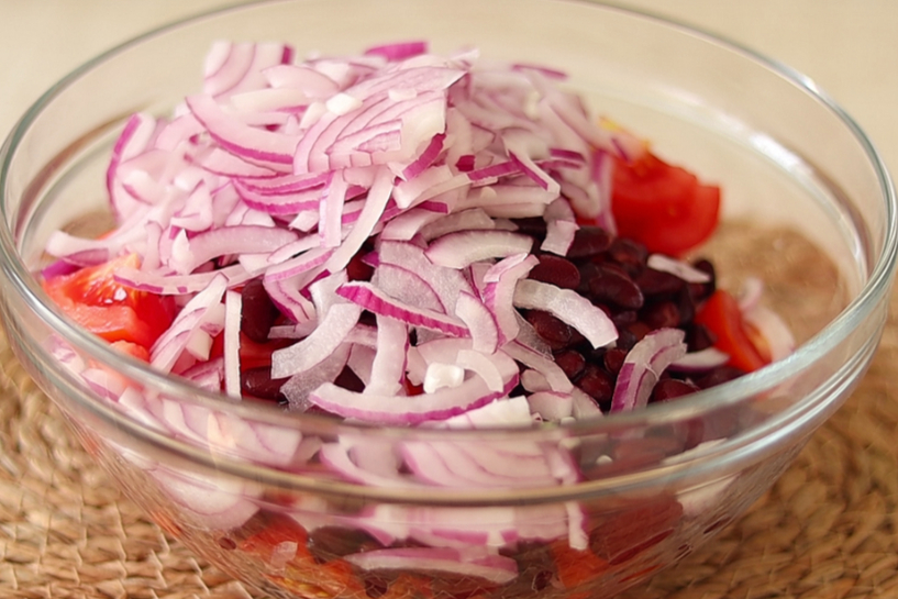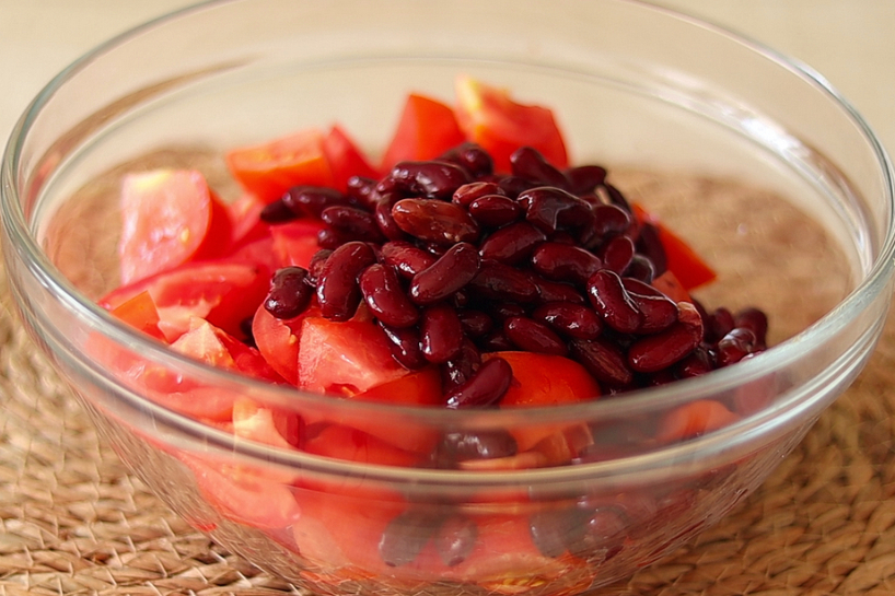 Galvenās šī salāta sastāvdaļas ir tomāts un konservētas pupiņas. Tomātus vislabāk izvēlēties nogatavojušos.