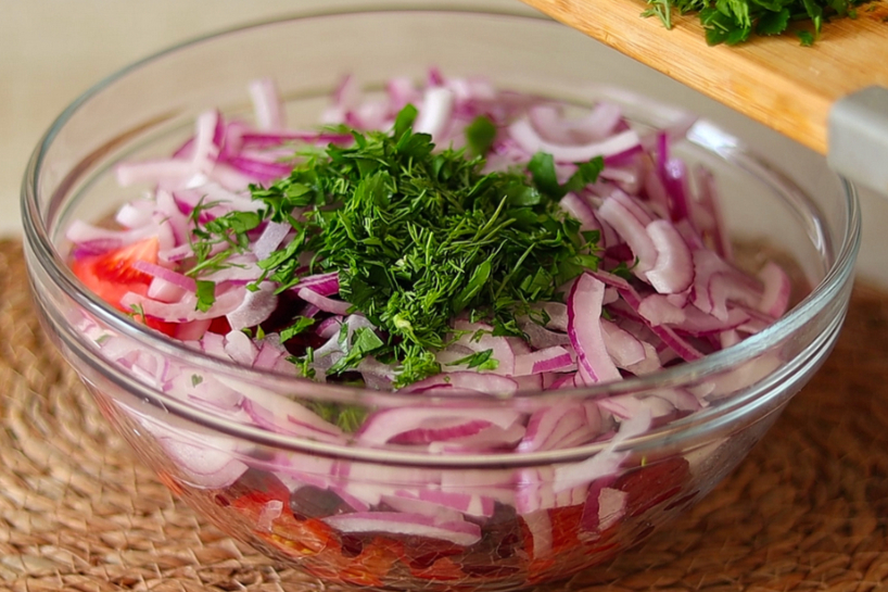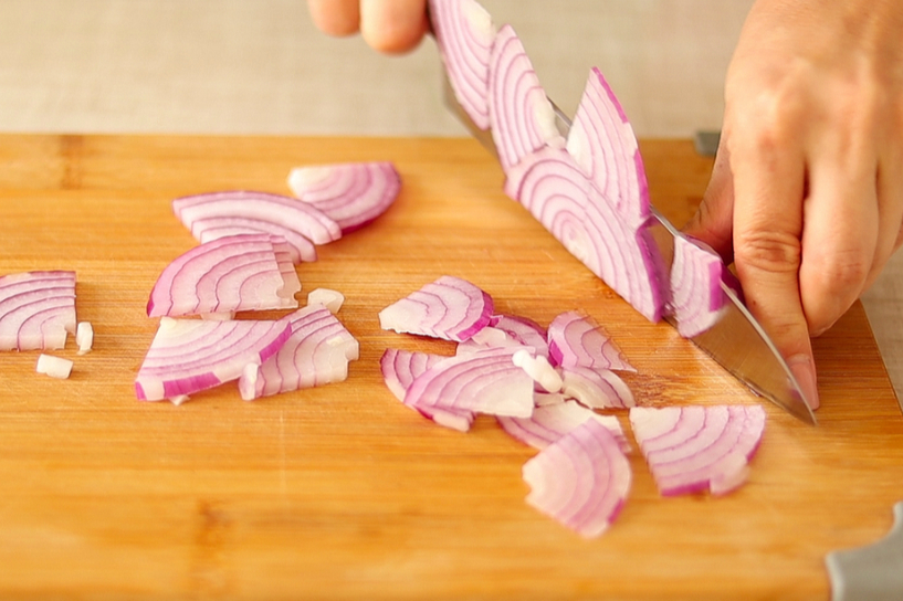 Sīpolu var izmantot parasto. Sagriež sarkano sīpolu.