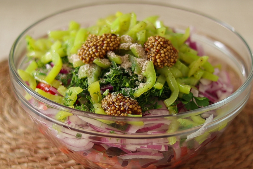 Pievieno 2 tējkarotes sāls (var izmantot arī parasto sāli), 3 tējkarotes franču sinepju, 1 tējkaroti citrona sulas. Ja citrona sulas nav, salātu var aizliet ar ābolu etiķi vai augu eļļu.