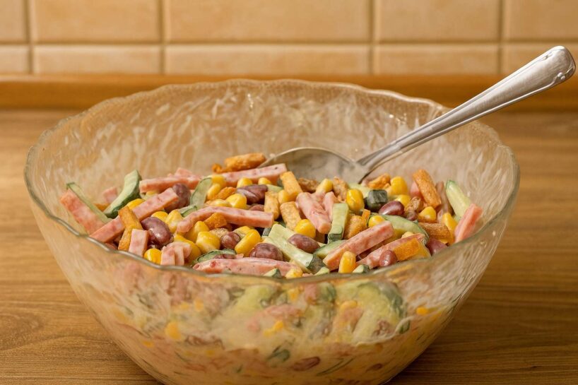 Šo salātu noslēpums ir ideālā garšu kombinācijā – viegli sālīta desiņa, kraukšķīgi gurķi, saldā kukurūza un sātīgās pupiņas. Savukārt neliela sauja sausiņu piešķir patīkamu kraukšķīgumu, bet majonēze visu apvieno vienotā, maigi krēmīgā garšā. Rezultāts – sātīgi, bet viegli salāti, kurus noteikti gribēsies atkārtot.