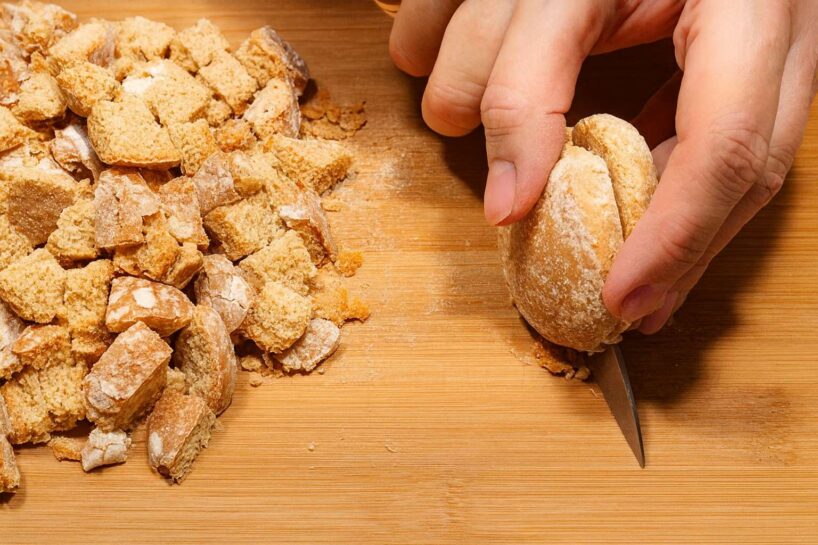 Prjaņikus sagriez nelielos kubiņos. Tie būs kūkas “kārtas”.