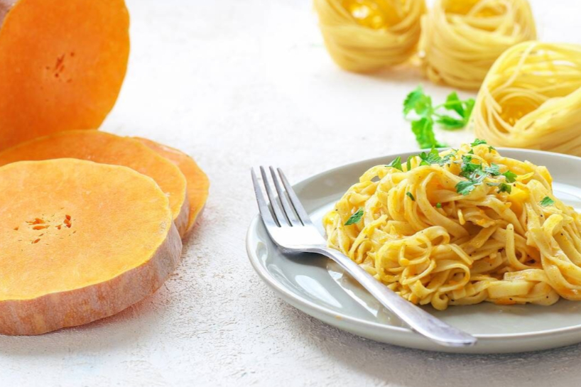 Gatavo pastu sajaucam ar ceptu ķirbi un apcepto pančetu. Pat ja mums ir bekons — ēdiena autentiskuma labad sauksim to par pančetu. Pievienojam citronu sulu svaigumam un rīvētu parmezānu pikantumam. Ķirbja un pastas kombinācija mūsu zemē ir diezgan reta, taču mēs taču vēlējāmies ko negaidītu un izteikti rudens noskaņās. Nobaudīsim!
