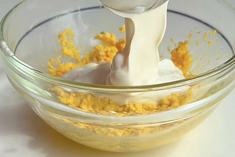 Dzeltenumus saspaida ar dakšiņu, pievieno augu eļļu, skābo krējumu un majonēzi, pieliek sāli un piparus. Visu rūpīgi samaisa līdz gludai, maigi krēmīgai mērcei.