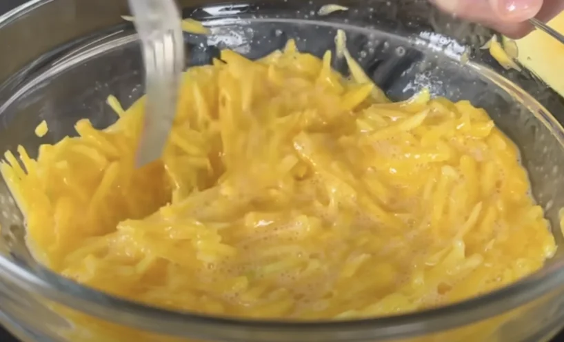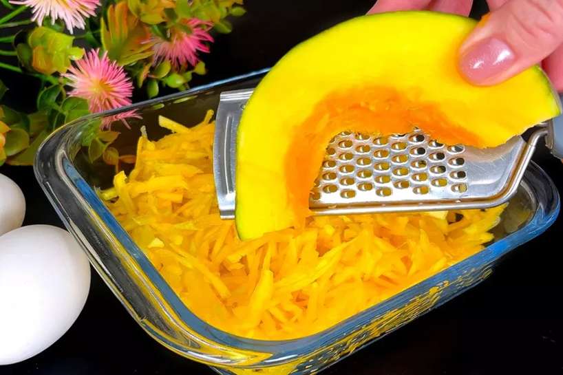 Nomizo ķirbi un sarīvē to uz rupjās rīves. Lielā bļodā sajauc ar olām – masa kļūs viegla un nedaudz mitra.