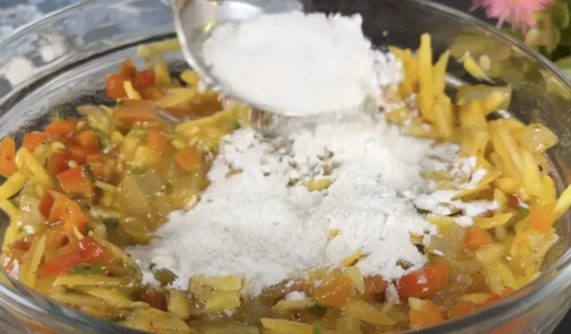 Ķirbju masu apvieno ar apceptajiem dārzeņiem. Pievieno sāli, papriku, itāļu garšvielas un miltus. Viegli samaisi, lai viss vienmērīgi sajauktos.